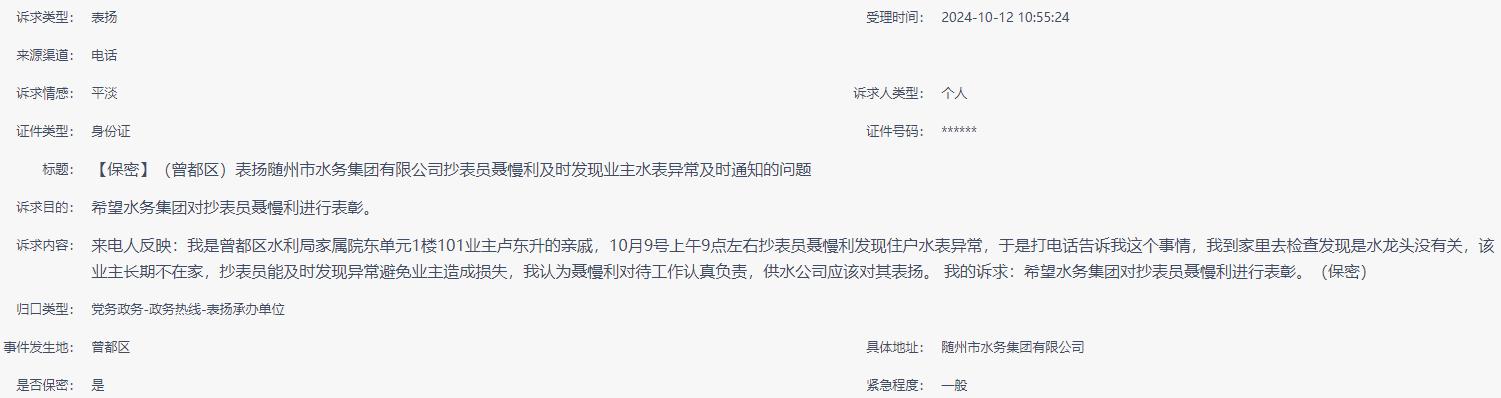 來電人反映:我是曾都區(qū)水利局家屬院東單元1樓101業(yè)主盧東升的親戚,10月9號上午9點左右抄表員聶慢利發(fā)現住戶水表異常,于是打電話告訴我這個事情,我到家里去檢查發(fā)現是水龍頭沒有關,該業(yè)主長期不在家,抄表員能及時發(fā)現異常避免業(yè)主造成損失,我認為聶慢利對待工作認真負責,供水公司應該對其表揚。 我的訴求:希望水務集團對抄表員聶慢利進行表彰。(保密) |