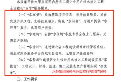 1.“零環(huán)節(jié)”:客戶需要用水時(shí),即時(shí)通水; 2.“零跑腿”:安排“客服專員”全程上門服務(wù),無需客戶跑腿; 3.“零資料”:通過湖北省工程建設(shè)審批系統(tǒng)、湖北省政務(wù)服務(wù)平臺(tái)獲取項(xiàng)目信息,無需客戶提報(bào)資料; 4.“零費(fèi)用”:針對(duì)企業(yè)用戶供水接入項(xiàng)目,工程設(shè)計(jì)、材料、監(jiān)理、施工全部免費(fèi)。 |
