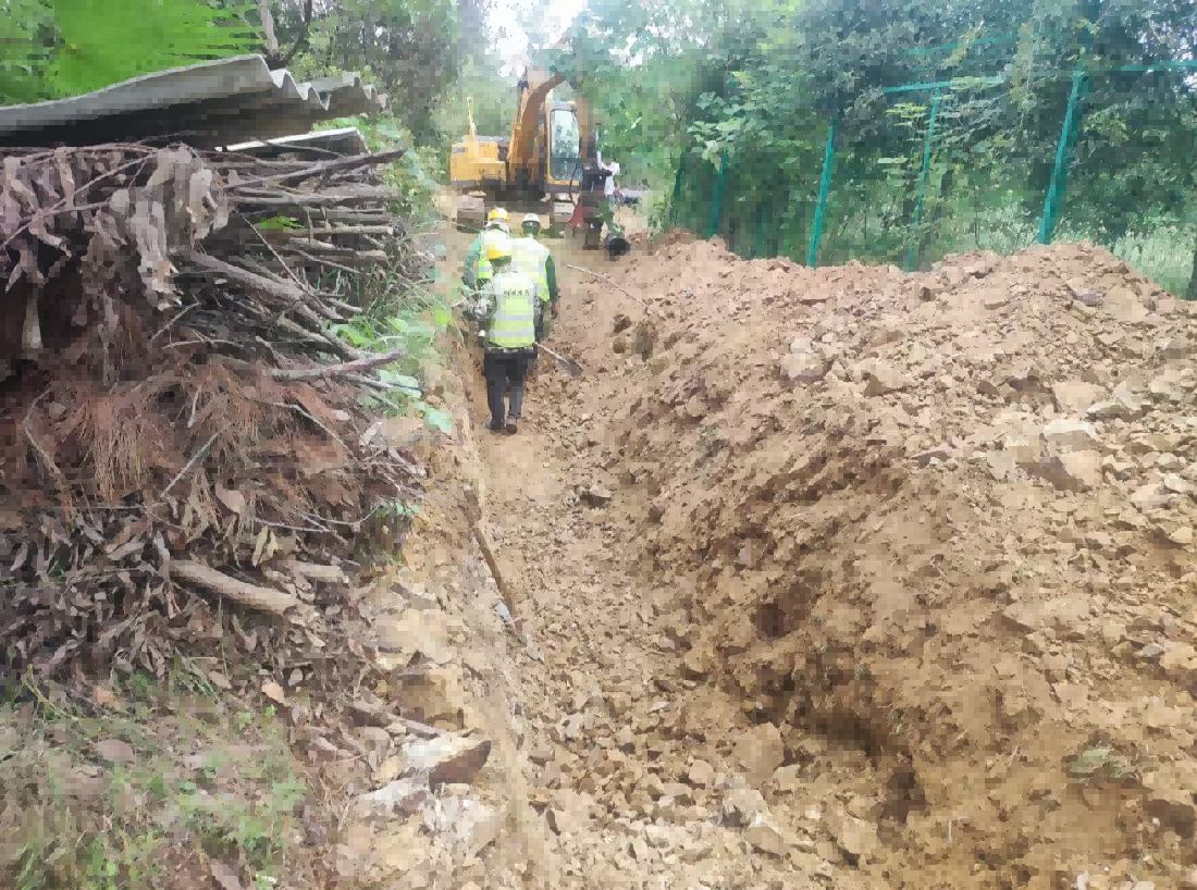 機(jī)電學(xué)校DN250球墨管供水工程線路處于山地丘陵地帶,沿線涉及鄉(xiāng)村道路、開墾菜園、陡峭山體等多重地質(zhì)和復(fù)雜環(huán)境考驗(yàn)。在沿機(jī)電學(xué)校圍墻邊緣鋪設(shè)段,鄉(xiāng)村道路與圍墻之間不足3米的狹窄空間,成為施工線路上的“攔路虎”,該道路是周邊居民日常出行的主要通道,一旦長時間阻斷,將嚴(yán)重影響群眾生活。項(xiàng)目部與學(xué)校和村委共同研討下,最終確定利用2天時間,集中突擊,調(diào)用多臺設(shè)備,全力沖刺,快速施工完成后復(fù)路于民,順利啃下硬骨頭。