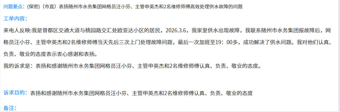 近日,隨州水務(wù)集團收到市民通過12345政務(wù)服務(wù)便民熱線打來的專屬表揚電話,市民王女士對工作人員高效響應(yīng)、貼心服務(wù)的表現(xiàn)致以誠摯感謝。這一通暖心來電,既是對供水服務(wù)的高度認可,更是水務(wù)集團堅守民生初心、彰顯服務(wù)溫度的生動體現(xiàn)。